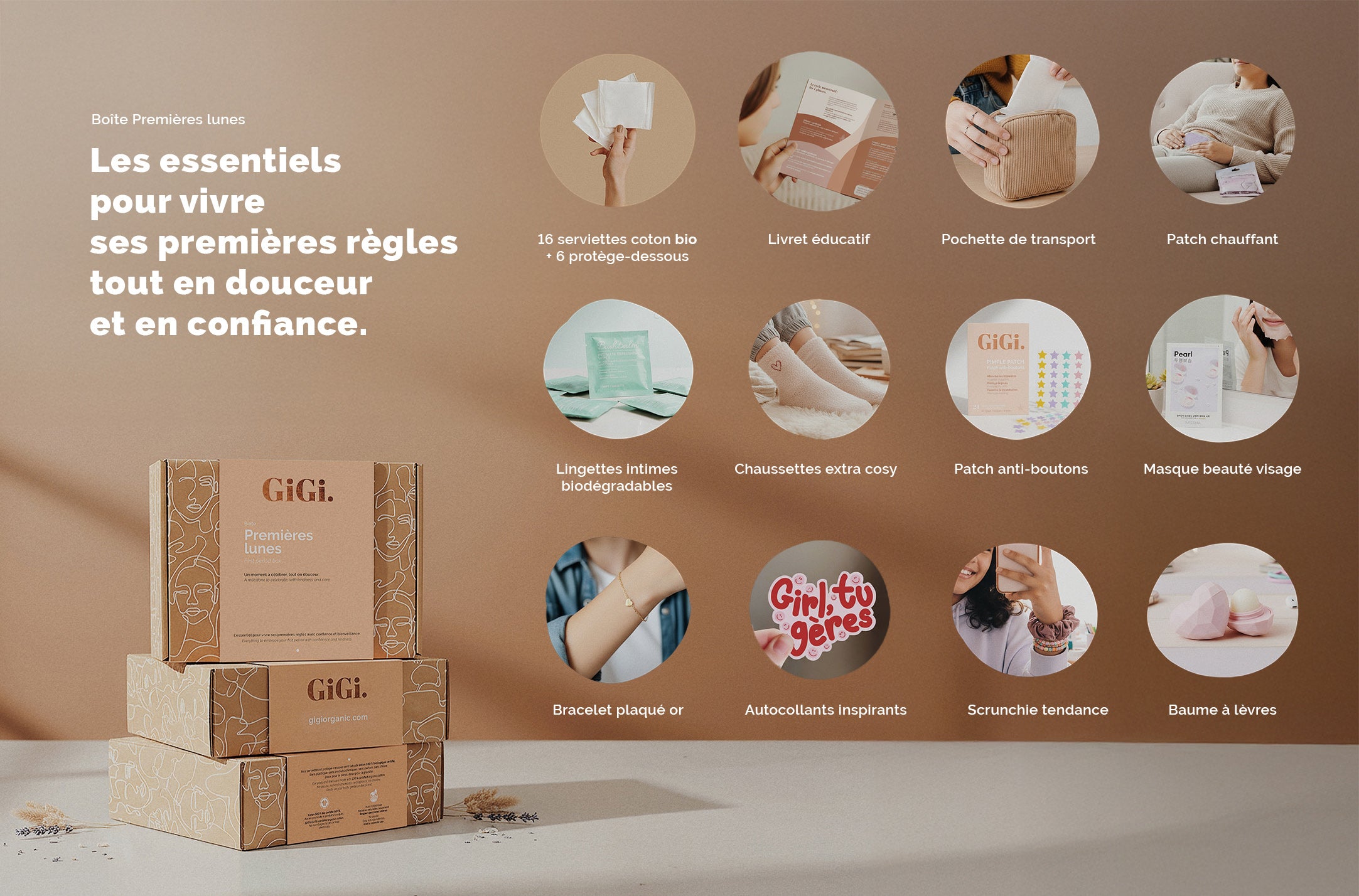 La boîte comprend tout ce dont une jeune ado a besoin pour aborder ses premières règles en toute sérénité, avec confort et style:
